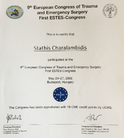 Το Μάιο του 2008 ο ορθοπαιδικός χειρουργός Ευστάθιος Χαραλαμπίδης συμμετείχε στο 9th European Congress of Trauma and Emergency Surgery – 1st ESTES Congress που πραγματοποιήθηκε στη Βουδαπέστη της Ουγγαρίας από 24 έως 27 Μαΐου.