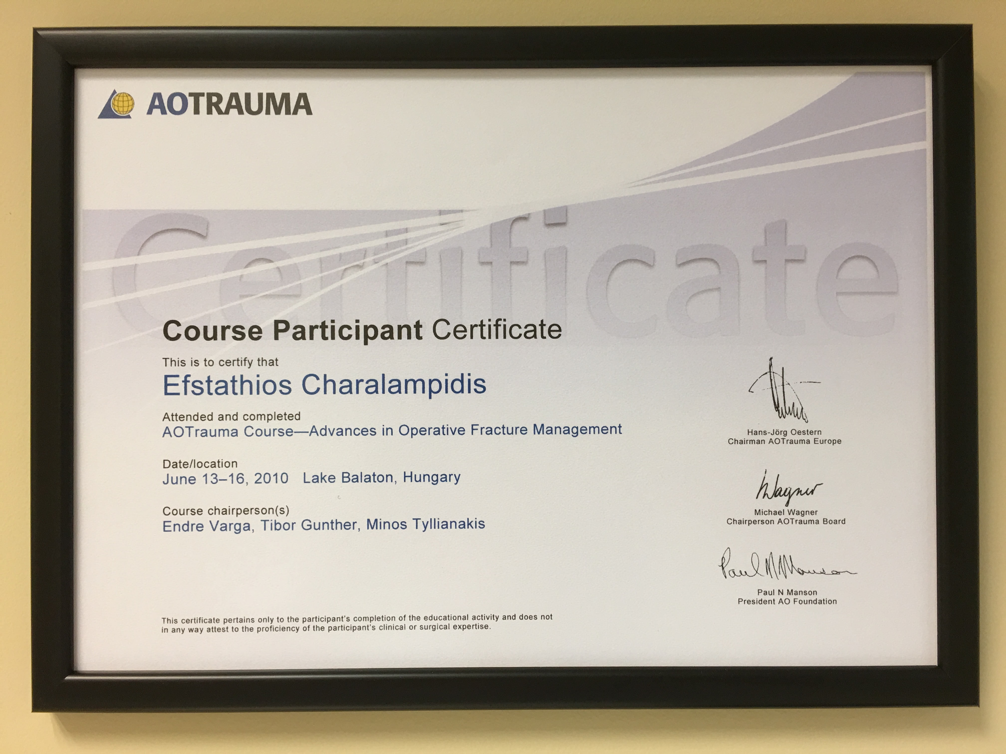 Μετά την ολοκλήρωση του πρώτου σεμιναρίου της AO Foundation με επιτυχία, ο ορθοπαιδικός χειρουργός Ευστάθιος Χαραλαμπίδης παρακολούθησε το δεύτερου επιπέδου εκπαιδευτικό σεμινάριο της AO TRAUMA με τίτλο "Advances in operative fracture management". Το σεμινάριο πραγματοποιήθηκε στη λίμνη Balaton στην Ουγγαρία από 13 έως 16 Ιουνίου 2010.