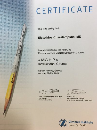 Ο ορθοπαιδικός χειρουργός Ευστάθιος Χαραλαμπίδης τον Μάιο του 2014 παρακολούθησε το Medical Education Course: «MIS HIP» Instructional course που έγινε στο νοσοκομείο ΚΑΤ στην Αθήνα. Η εκπαίδευση πραγματοποιήθηκε υπό την αιγίδα του Zimmer Institute και περιελάμβανε διαλέξεις αλλά και live surgery από τον Dr Robert Hube MD.